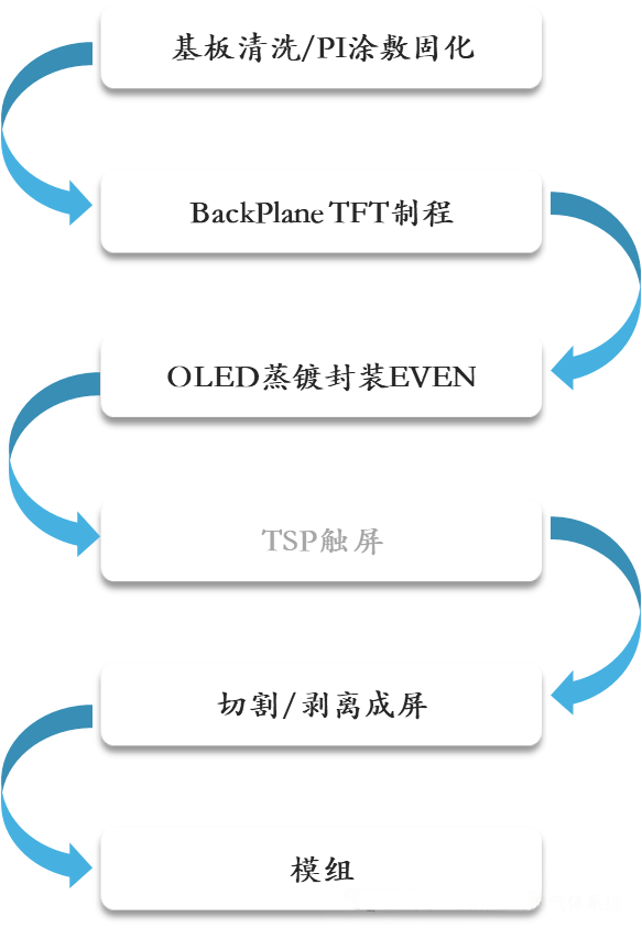 Основният производствен процес на AMOLED включва няколко високотехнологични процеса на единица. В процеса на Backplane TFT (BP), технологията за нискотемпературен поликристален силиций (LTPS) стана масова поради високата мобилност на електроните. Неговият процес на структура на горната врата включва стъпки като отлагане на буферен слой, имплантиране на канални йони, кристализация с лазерно отгряване (ELA), разпръскване на метал на затвора и имплантиране на източник-дрейн. Специалните газове играят критична роля при отлагането, модификацията и ецването на тънък слой: например процесите PECVD използват SiH₄/N2O/NH3 за отлагане на тънки филми a-Si/SiNx/SiOx; Отлагането на атомен слой (ALD) използва TMA и H₂O за образуване на капсулиращи слоеве Al₂O3; сухото ецване постига високопрецизно моделиране чрез газове като CF4/SF6/Cl2, където BCl3 се използва за намаляване на слоевете от метален оксид, а Cl2 генерира летливи продукти за ецване, осигурявайки чист и ефективен процес.