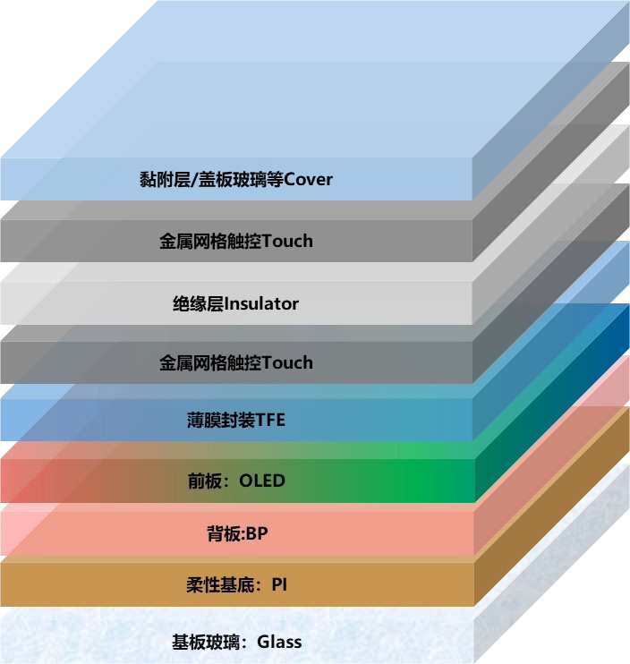 Основната му структура включва OLED светлоизлъчващ слой, TFT задна платка, метални електроди, субстратно стъкло и корпус.